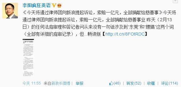 针对昨日有媒体传出“李阳前妻Kim指证其东莞嫖娼”消息一事,李阳今日中午在其微博发文表示,今天将通过律师团向新浪提起诉讼,索赔一亿元,全部捐献给慈善事业。