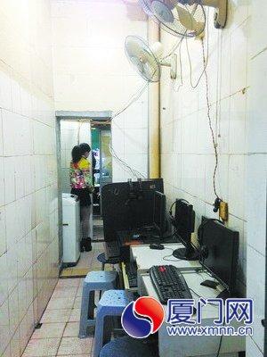 通道尽头就是后门,似乎没有其他空间了,其实不然,在后门边上还隐藏着一个大约六平方米的小房间,里面摆了八台电脑,六名男子挤在里面上网。空间狭小、空气不流通,再加上有人吸烟,满屋子乌烟瘴气。经营者承认,这是一家无证无照的黑网吧。