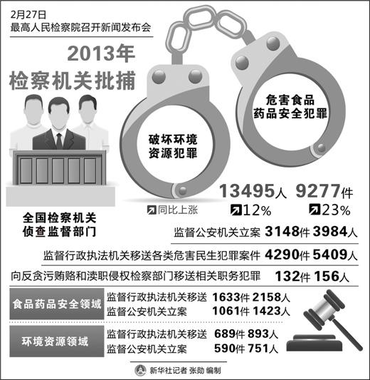 记者2月27日从最高人民检察院获悉,2013年,全国检察机关批捕破坏环境资源犯罪和危害食品药品安全犯罪共9277件13495人,同比分别增长23%和12%。