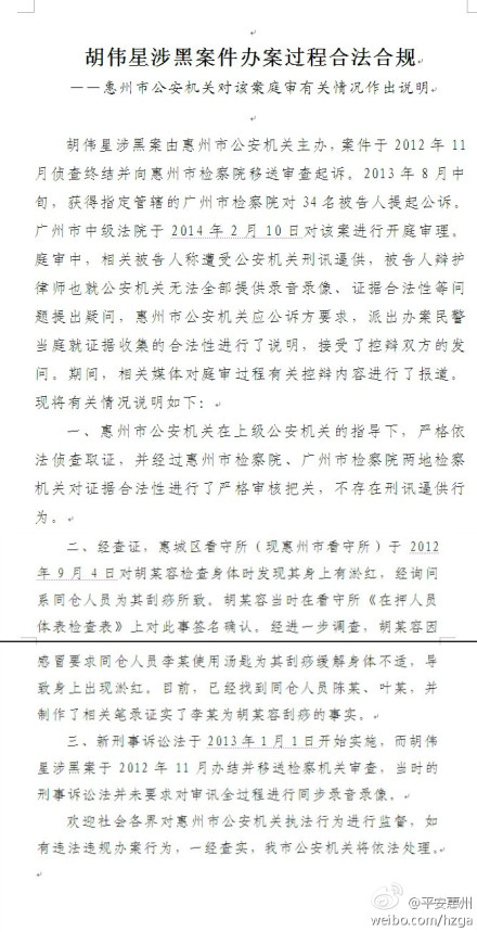 胡伟星涉黑案由惠州市公安机关主办,案件于2012年11月侦查终结并向惠州市检察院移送审查起诉。2013年8月中旬,获得指定管辖的广州市检察院对34名被告人提起公诉。广州市中级法院于2014年2月10日对该案进行开庭审理。庭审中,相关被告人称遭受公安机关刑讯逼供,被告人辩护律师也就公安机关无法全部提供录音录像、证据合法性等问题提出疑问,惠州市公安机关应公诉方要求,派出办案民警当庭就证据收集的合法性进行了说明,接受了控辩双方的发问。期间,相关媒体对庭审过程有关控辩内容进行了报道。现将有关情况说明如下: