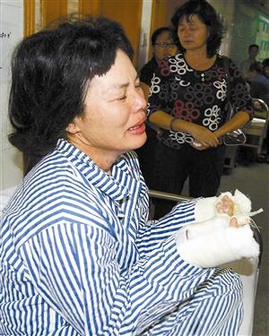 叶女士双手被烧伤,坐在病床上痛苦地讲述事发经过。