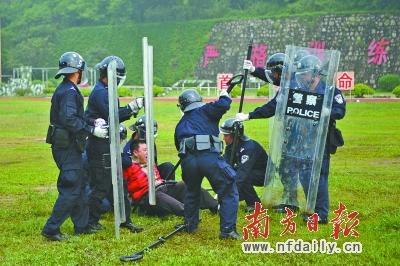 经过一番斗智斗勇,持刀“歹徒”被制服。 南方日报记者 王云 摄