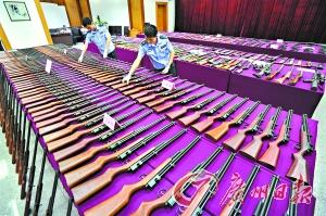 昨日,广东警方现场展示在专项行动中收缴的枪支。