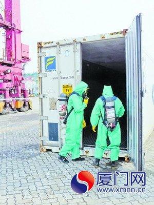 在尚未明确气体种类的情况下,根据应急处置预案,厦门东渡检验检疫局立即成立了领导小组和现场工作组,专业技术人员全副武装入箱检测。检测结果初步显示,集装箱里弥漫着有毒气体。