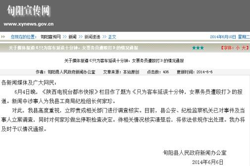 日前,网曝“客车延误十分钟,女票务遭殴打,打人者竟是旬阳县工商局纪检组组长”事件引起网民关注。陕西旬阳县人民政府新闻办公室回应称,对当事人做出停职检查决定,司法部门已立案调查。