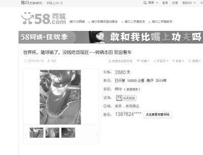 6月16日,海口58同城网上一条二手车销售信息引起记者关注。 一位网名为“阿帅”的网友发帖称,他因为参与世界杯赌球输了,现在没钱吃饭,低价转让一辆购于2010年的摩托车,欢迎看车,发布了摩托车的图片,并留下了手机号。