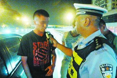 为维护辖区社会治安稳定,严厉打击足球“世界杯”期间醉驾及酒后驾驶等交通违法行为,营造良好的交通环境,湖里派出所结合辖区交通实际,加大对易发生事故重点路段的整治力度。7月2日晚,湖里派出所民警、协警通宵在东渡路滨北路口至海山路口段设卡盘查,连续抓获20名交通违法嫌疑人,查破危险驾驶案12起,酒后驾驶案7起,无证驾驶案1起。上图为民警对驾驶员进行酒精测试。(徐立华)