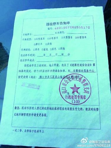 冯先生在微博中说道,“前几天在某酒店旁的路上看到一张奇葩罚单贴在一辆小轿车上,罚单竟然是空白的!很牛!是忘记填了呢还是随便你填?”他在微博上配了两张图片,一张是被贴单的小轿车,另一张是没有任何字迹的违章停车罚单,罚单上只有路段民警和海口交警支队的印章。微博一经发出立即引起网友热议,评论中有人质疑,“罚单上没有车牌号码和相关信息,这个罚单能否生效?”也有人表示,“会不会是车主的个人行为?将此前用过的罚单再贴在自己车上,想躲避交警的处罚。”