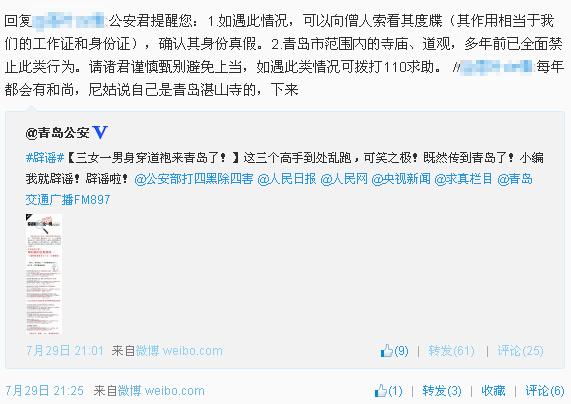 29日晚9时许,青岛市公安局发布长微博对此事进行分析:其中 “三女一男穿道袍出现”的信息,在2013年7月24日分别出现在黑龙江和江西两个相距甚远的地方。“若不是其四人都会绝世武功可日行千里,不然根本无法解释”。