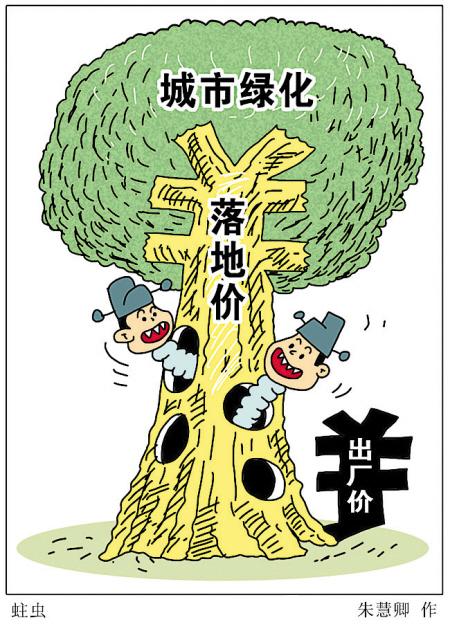 一棵“超级银杏”,出厂价是几千元,但落地价却变成了5万元。动辄花上千万元之巨去找所谓的知名公司进行绿化设计,但其实就是几个刚毕业的学生参照以往案例稍加改动,便“大功告成”。其中巨额的差价都去哪儿了?记者近日调查发现,在一些地方频现绿化奢侈浪费的背后,掩藏“黑色内幕”与“绿色腐败”。(8月20日《京华时报》)