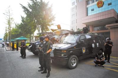 昨天,特警在法庭外警戒。京华时报记者张淑玲摄