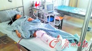昨日上午11时许,记者在武警医院外科病房内看见了尹先生,他的右手前臂、手掌和右脚都缠着厚厚的绷带,右边膝盖在早上缝了10针,左手仍挂着吊瓶。据院方介绍,经过医生诊断,尹先生的右前臂和右足多发性骨折,全身多处皮肤挫裂伤,而他的妻子则是右下肢开放性骨折,部分骨头外露,伴活动性出血,需要进行手术治疗。