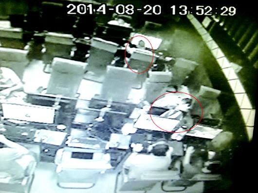 两嫌犯假装上网,利用手中铁丝作案。 监控截图