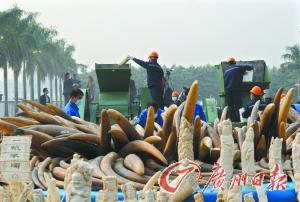 今年1月6日,广州市公开销毁6.1吨罚没象牙。(资料图片)
