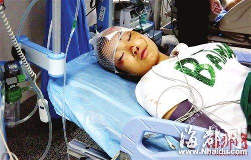 记者随后来到省立医院急诊科,女孩还在抢救室内的床上。女孩身穿白色T恤,衣服上有不少干掉的血迹,头部左侧已被包扎起来。女孩迷迷糊糊地告诉记者,自己今年17岁,是福州人,13日晚上走在医院附近时被撞倒受伤,其他的都不记得了。