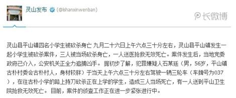据广西灵山县政府官方微博消息,灵山县平山镇4名小学生被砍杀身亡。9月26日上午6点30分左右,灵山县平山镇发生一起小学生被砍杀案件,3人被当场砍杀身亡,1人送医抢救无效死亡。