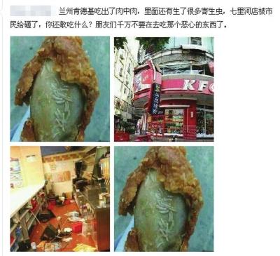 9月25日早,记者在朋友QQ空间内看到一则消息,附有4张图片,上面的文字内容称兰州肯德基吃出了肉中肉,里面生了很多寄生虫,七里河店被市民给砸了,你还敢吃什么?朋友们千万不要再去吃那个恶心的东西了。随后,记者联系到该朋友,他称发上这样的内容,没有对事件本身进行过核实,图片的来源是他的朋友,之所以会在QQ空间内发这样的图片,是因为此内容涉及到了食品安全,他也是想提醒周边的朋友们要重视食品安全的问题。