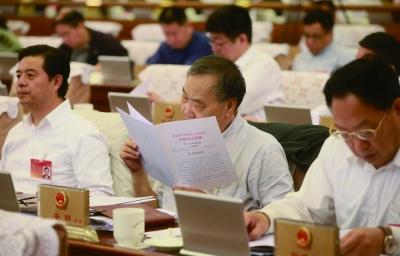 人大代表安钢在会上认真阅读审议报告摄/记者 付丁