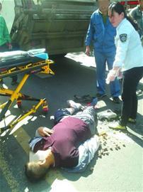 “这对老夫妇可能是从旁边的市场回来,沿着斑马线过马路时,被这辆运送垃圾的环卫车给撞倒了。”记者闻讯赶到现场时看到,在人民路北向南车道最内侧停着一辆环卫车,车后面人行横道上躺着一名穿着咖啡色T恤衫的老大爷,他的双腿有明显开放性骨折,鲜血流了一地,身边散落着桂圆等物品。