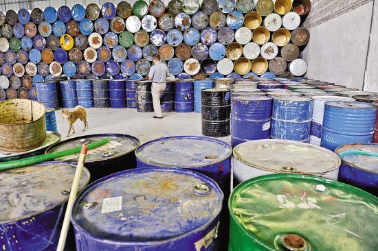 根据群众举报,16日下午,羊城晚报记者跟随白云区安监局执法人员,来到了白云区太和镇和龙九社过坑窿靠帽峰山边而建的仓库。记者看到,约500多平方米的仓库中,储存有3桶丙二醇甲醚(200公斤/桶)、2桶二乙二醇单丁醚(190公斤/桶),其他无标签无名液体共143桶(180公斤/桶),现场没有防爆、防雷、防静电、防泄露等装置。据执法人员介绍,白云区安监局已经在15日随机抽取了其中液体样品送检,经广州化工分析测试中心检测显示,两种液体均为易燃危险化学品。