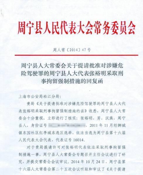 今年8月14日,上海市公安局松江公安分局向福建省周宁县人大常委会发出《关于提请批准对涉嫌危险驾驶罪的周宁县人大代表张裕明采取刑事拘留强制措施的函》。
