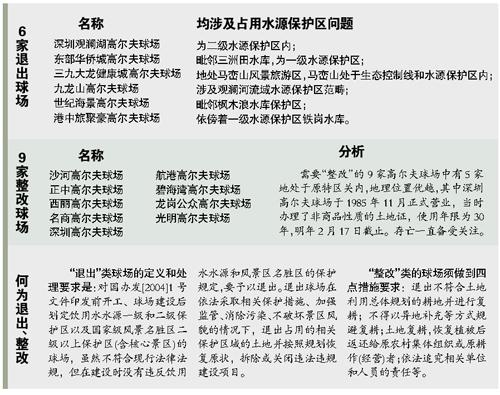深圳观澜湖这次被列入“退出”的主要原因是部分球场地块虽然手续齐全,但属于现在的二级水源保护区内。这次清理政策对“退出”也明确定义为“虽然不符合现行法律法规,但在建设时没有违反饮用水水源保护规定”。所以,观澜湖的情况是当年法律手续具备,但需要按照政策进行调整。 (记者 肖陆军)