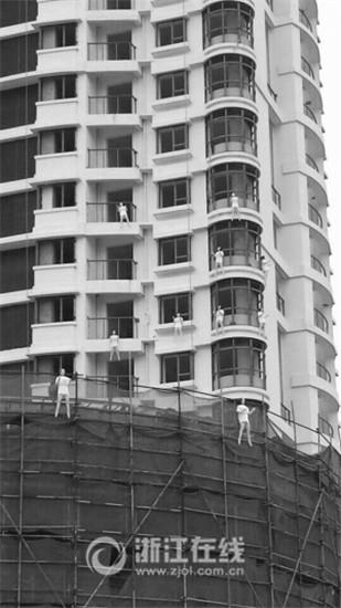 今年8月份,网上流传着一张图片:在一栋在建的高楼上,挂着10多个真人大小的充气娃娃,远看就像有人在集体跳楼。