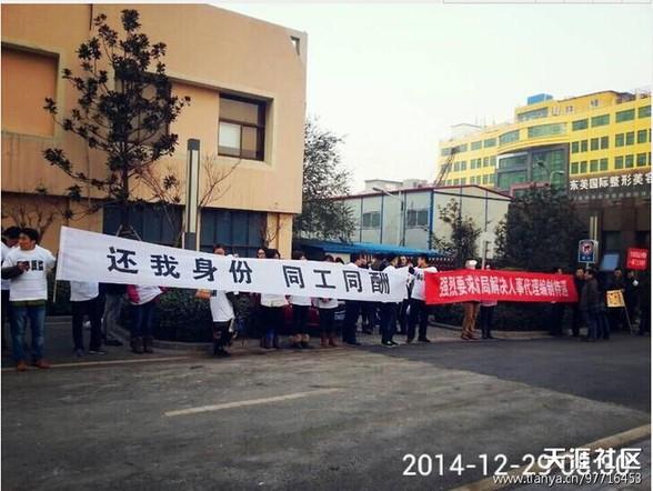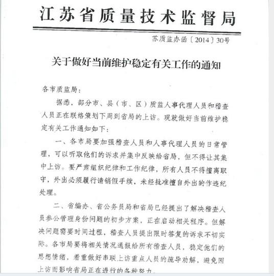 今天(29日)中午,一篇题为《江苏质监,人事代理人员维权算违纪?》的帖子出现在网上,引起众多网友围观。贴文直指江苏省质监局以维护稳定的名义下发文件,强行干预基层职工维权,并配发了“苏质监办函[2014]30号”文件的照片,以及多人拉有“还我身份 同工同酬”横幅的上访照片等。