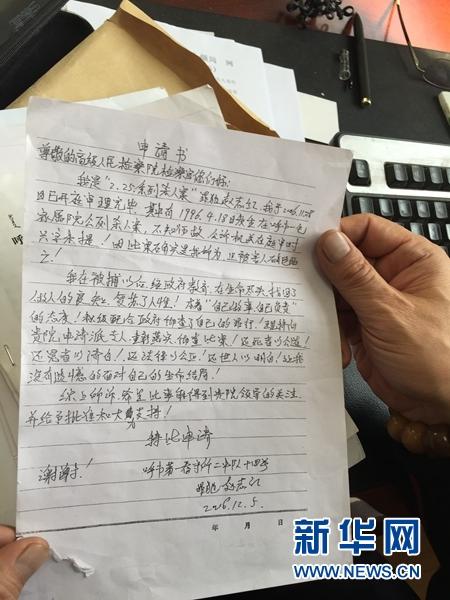 这是当年赵志红递出的偿命申请书复印件(1月5日摄)。 新华社记者 张丽娜 摄