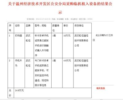 公示截图显示,温州经济技术开发区公安分局花费4.9万元,购入专门针对安卓手机或苹果已越狱手机,可实时监控手机通话,短信和照片等信息的手机木马一套。花费10万元购入针对安卓手机或苹果已越狱手机进行接触式植入木马程序的打码器一套。供货单位显示为武汉虹信通信技术有限责任公司。
