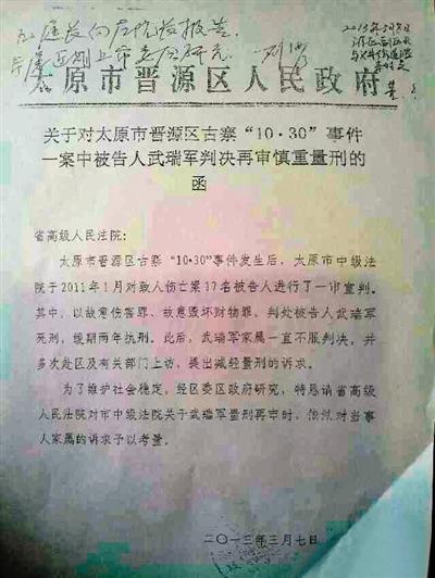 这两份公函都印有“太原市晋源区人民政府”字样,标题均为“关于对太原市晋源区古寨‘10·30’事件一案中被告人武瑞军判决重审慎重量刑的函”。两份函件意思相同,提到武瑞军在被判处死刑、缓期两年执行后,其家属一直不服判决,多次到区及有关部门上访,并提出减轻量刑的诉求。