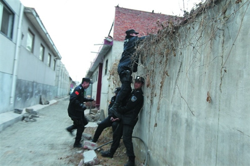 随后,特警队员迅速攀墙入院,小院里声音嘈杂,一名特警迅速打开大门,大量持枪特警冲了进去,将急于出门逃跑的一伙人强行拦住,并全部堵在屋内。