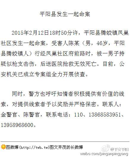2月13日,有网友通过浙江在线官方微信(zjolwx)报料称:2月12日晚,温州市平阳县凤巢社区发生一起枪杀案,当地一村干部遇害。今天,浙江在线记者自平阳警方处得到证实,死者确系平阳腾蛟镇山边村村长陈某,死前遭到疑似枪支击伤。