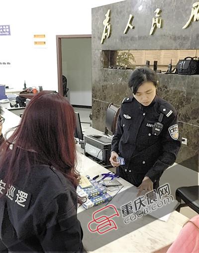 民警邵小轶查看小郑携带的杀蟑饵剂和消杀登记表。 记者 王梓涵 摄