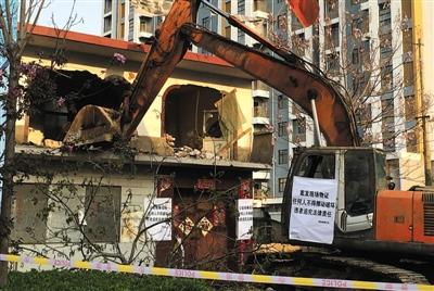 新京报记者看到,一台挖掘机停在唐家门口,铲斗戳进二楼屋内,破开一块长宽两米多的大洞。当地警方已在现场实施戒严,数百路人在马路对面围观。