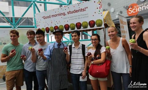 香港科技大学校长陈繁昌(左四)开学首日为学生派发苹果。来源:人民网