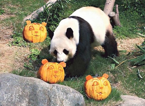 香港海洋公园雕万圣节南瓜送大熊猫乐乐(图)