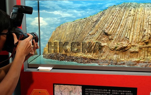 7月10日,香港西贡地质公园火山探知馆内展出六角型岩柱模型。一亿四千万年前,西贡一带火山发生极度猛烈的爆发,连串的火山活动形成世界罕有的六角型岩 柱,平均直径1.2米,出露高度可达100米。世界其他地方的六角形岩柱主要由深灰色玄武岩构成,香港的酸性岩柱是浅色的流纹质火山岩,甚为稀有。香港中通社图片