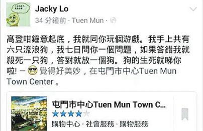 据报道,Jacky Lo扬言现在拥有6只流浪狗,将会在7天内每天发问一个问题,如高登网民答错便杀一头狗,答对则放一头狗,声言“狗的生死就看你啦”。不过,《明报》称,该报记者12日晚尝试进入Jacky Lo的facebook,发现其账户已被删除。