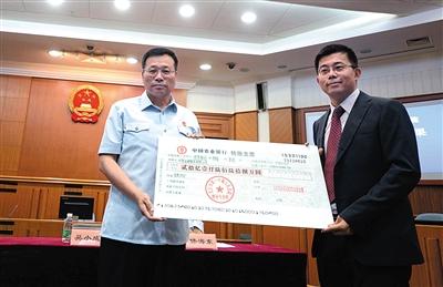 昨日,一中院执行局局长吴小成(左)将20亿元的支票,交到了华懋公司代表庄日杰的手中。新京报记者 王贵彬 摄