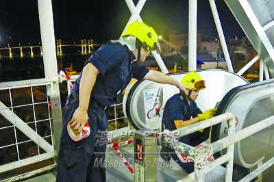 消防员在场调查,涉事扶手电梯暂时封闭。《澳门日报》