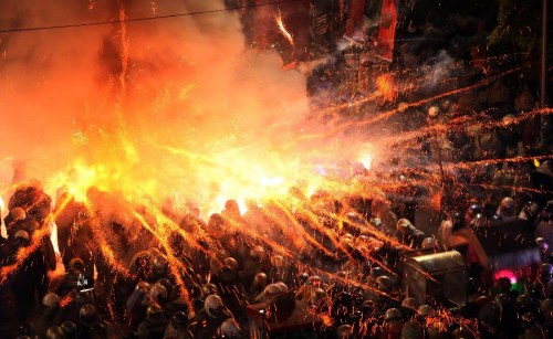 北天灯、南蜂炮,已经成为元宵节的重头戏。据说,被蜂炮炸过可以去掉霉运,所以每年盐水蜂炮总是吸引民众热情参与。所谓“蜂炮’,是由数万只冲天炮制作而成的,每一个冲天炮的炮芯连接在一起,一炮点燃,万炮连响,连续射出,震耳欲聋,声光齐作,在夜幕的衬托下蔚为壮观,撼人心魄。万炮齐发的景观与速度如同蜂群倾巢而出,故称之为“蜂炮”。