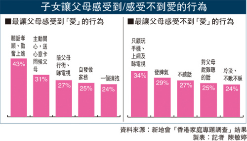 不过,子女只顾玩手机、上网及看电视(34%)是最令父母最感受不到爱的行为,较“发脾气”(29%)及“不听话”(27%)更严重。