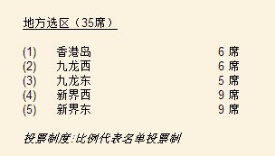 地方选区为5个,分别是:香港岛、九龙西、九龙东、新界西、新界东,根据各个选区的人口分布确定议席数。5个选区的候选人竞逐35个议席。
