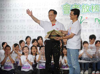 中新网8月4日电 据香港《大公报》报道,香港中学会考发榜在即,行政长官曾荫权3日到两间中学探访,为应届会考生打气。