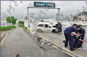 中新网8月7日电 据澳门日报报道,澳门西湾大桥旅游塔对面桥口处6日晨发生严重交通意外。一辆四驱车由旅游塔对面隧道驶往西湾大桥时,在出隧道口疑高速失控,先撞向旅游塔外电力机房,反弹回路面,冲上西湾大桥,横亘桥口,全车几近尽毁。