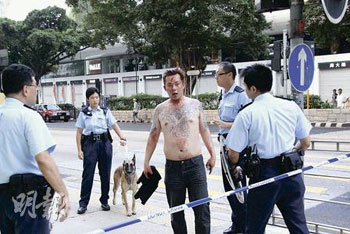 被追打的5名大汉中,27岁胡姓及30岁潘姓男子头部受伤,血流满面送院治理。伤者在送院前与其余3人在弥敦道街头接受警员调查,部分人脱去上衣,露出胸前及手臂纹身,情绪暴躁指骂好奇围观的途人,其中一人见记者拍摄更破口大骂,一度冲向记者,警员持盾牌及召警犬到场控制场面。