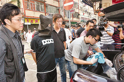 据报道,日前被捕的疑犯绰号“傻佬廷”,疑有黑帮“和×和”背景,与在逃的泰龙死敌“纹×忠”活跃于大角嘴区,并与“纹×忠”一直同列通缉名单上。警方日前接获线报,黑人物“傻佬廷”已潜返香港,“O记”探员随即展开调查,在其大角嘴大全街大富楼住所一带埋伏监视,并在中汇街趁他露面准备取车时予以拘捕。