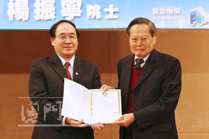 杨振宁于一月二十五日到访香港科大接受证书。许敖敖表示,授予荣誉教授给杨振宁是科大的荣耀,杨振宁个人卓越创新的远见与丰富的科学知识,将为科大未来的建议和发展产生深远的影响。