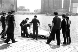 治安警、消防局和海关接报到场处理事件。消防员在民署人员协助下,开小艇到怀疑发现浮尸的湖面,证实为一具男性尸体。消防员利用绳索把尸体带到附近岸边,之后为其盖上白布,等候司警到场调查。